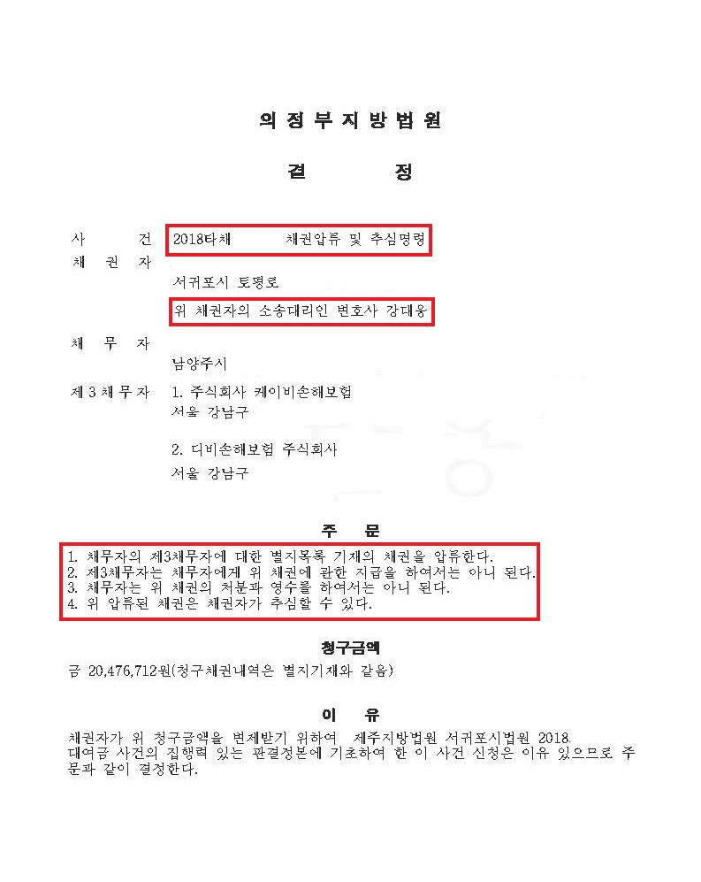 민사소송 | 채권 압류 및 추심 명령) 채무자의 보험사에 대한 채권에 대한 채권 압류 및 추심 명령 결정 성공 사례